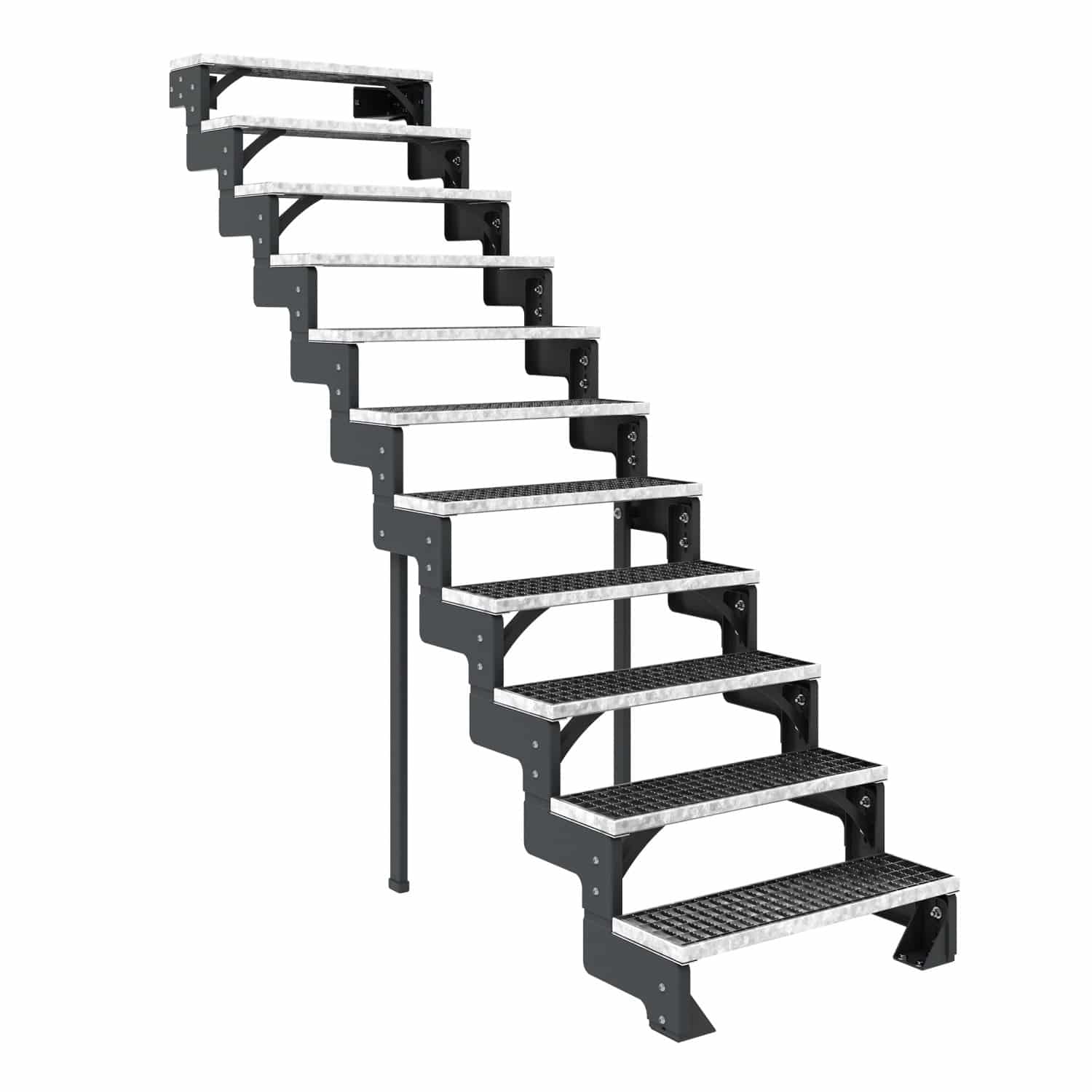 - Wetterbeständigkeit: Dank der feuerverzinkten Stahlkonstruktion ist die Treppe optimal vor Rost und Witterungseinflüssen geschützt.