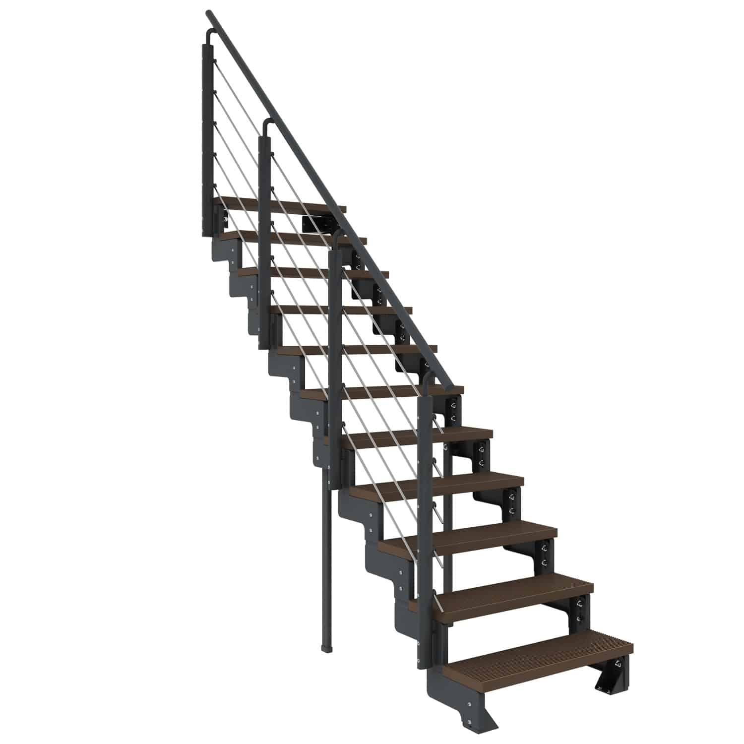Die anthrazitfarbene Pulverbeschichtung des Stahls verleiht der Treppe nicht nur ein edles Aussehen, sondern schützt sie auch vor Witterungseinflüssen und Korrosion. Die braunen Stufen bilden einen harmonischen Kontrast und sorgen für eine warme und einladende Atmosphäre. Mit den 11 Stufen und einer Breite von 80 cm bietet die Treppe ausreichend Platz für einen komfortablen Auf- und Abstieg. Das inkludierte Geländer sorgt für zusätzliche Sicherheit und Stabilität.