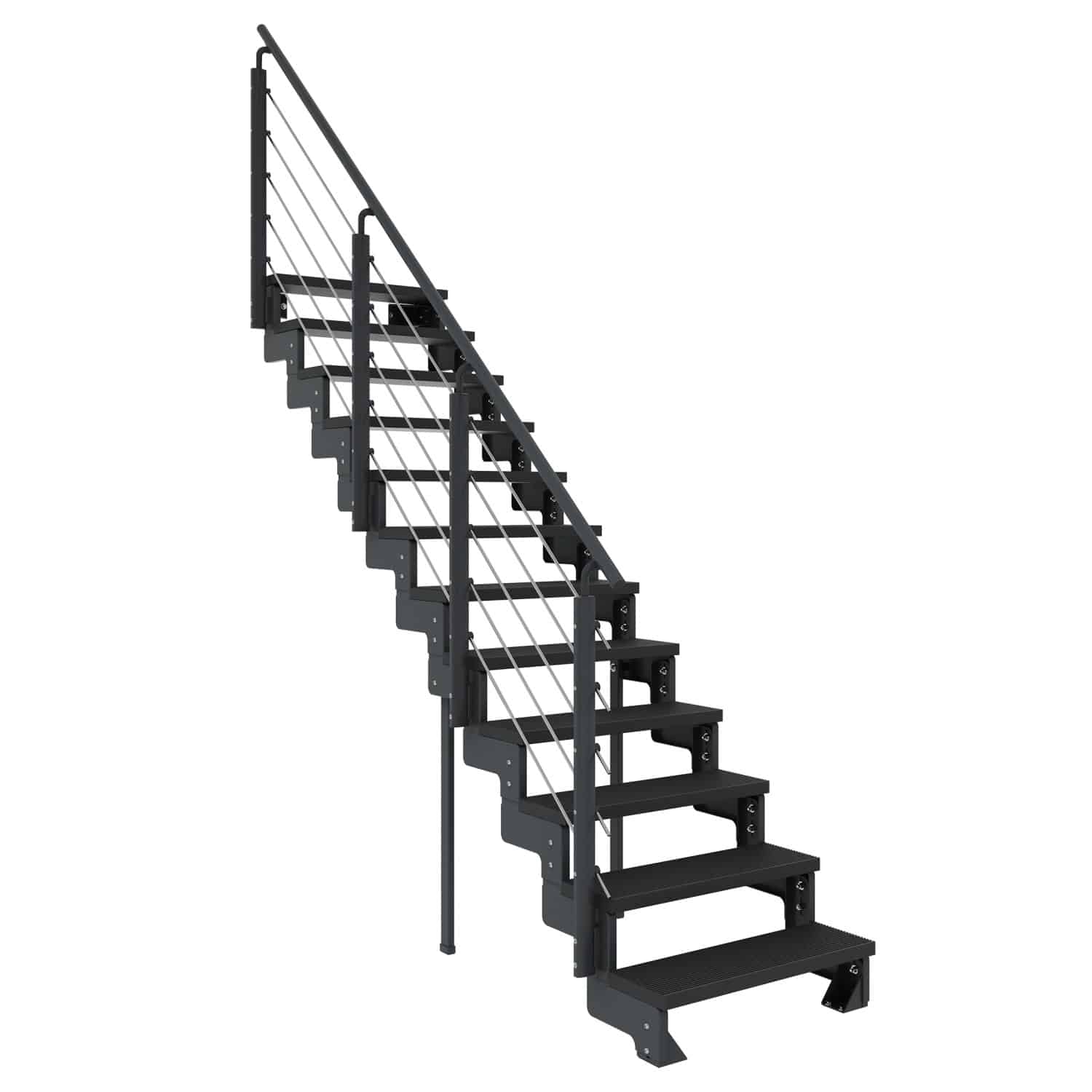 - Wetterbeständigkeit: Die spezielle Pulverbeschichtung schützt die Treppe vor Rost und anderen Witterungseinflüssen.