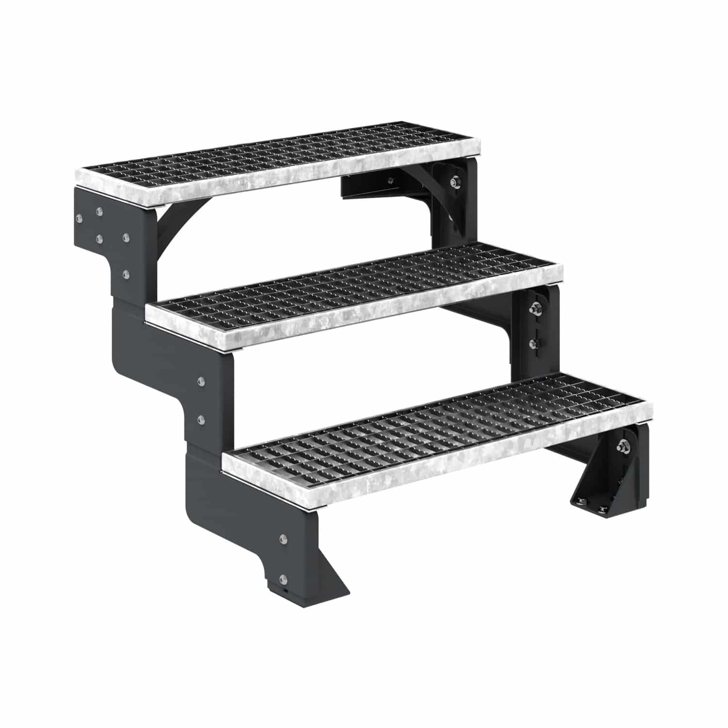 Die Dolle Außentreppe Gardentop Anthrazit ist aus feuerverzinktem Stahl gefertigt. Dieses Material ist besonders robust und widerstandsfähig gegenüber Korrosion. Die Feuerverzinkung schützt den Stahl vor Rost und sorgt dafür, dass Ihre Treppe auch nach Jahren noch wie neu aussieht. Die Gitterroststufen sind ebenfalls feuerverzinkt und bieten eine hohe Rutschfestigkeit, selbst bei Regen oder Schnee.