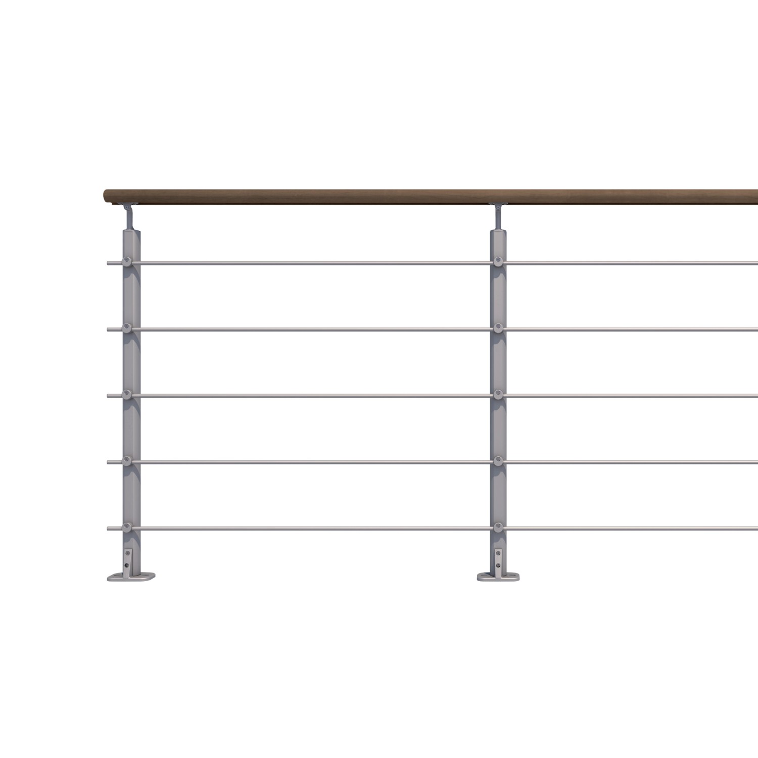 Aluminium: Das Gestell des Geländers besteht aus hochwertigem Aluminium, das für seine Leichtigkeit und Stabilität bekannt ist. Aluminium ist zudem rostfrei und witterungsbeständig, was es zum idealen Material für den Einsatz im Freien macht. Die graue Pulverbeschichtung verleiht dem Aluminium einen eleganten Look und schützt es zusätzlich vor Umwelteinflüssen.