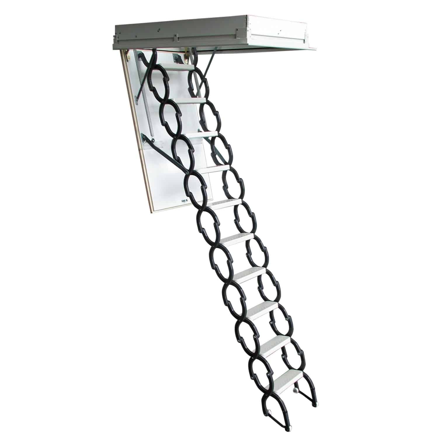 - Platzsparendes Design: Die Treppe lässt sich platzsparend zusammenklappen und verschwindet unauffällig in der Deckenöffnung.