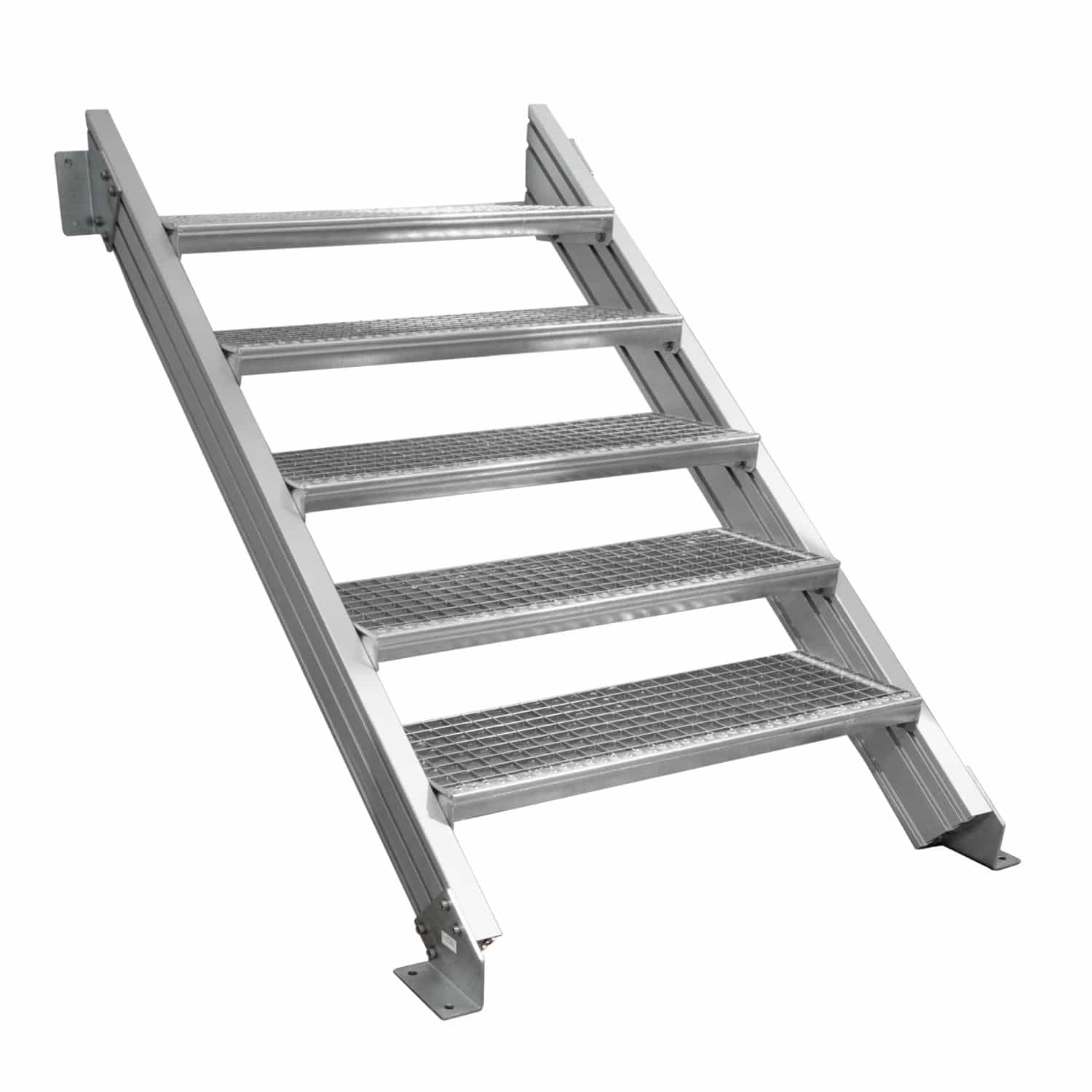 Diese Außentreppe vereint Funktionalität mit Ästhetik und bietet Ihnen ein Höchstmaß an Komfort und Sicherheit. Gefertigt aus hochwertigem Aluminium, trotzt sie Wind und Wetter und behält dabei stets ihr ansprechendes Aussehen. Die Gitterroststufen sorgen für optimalen Halt, selbst bei Regen oder Schnee, und garantieren somit einen sicheren Tritt.